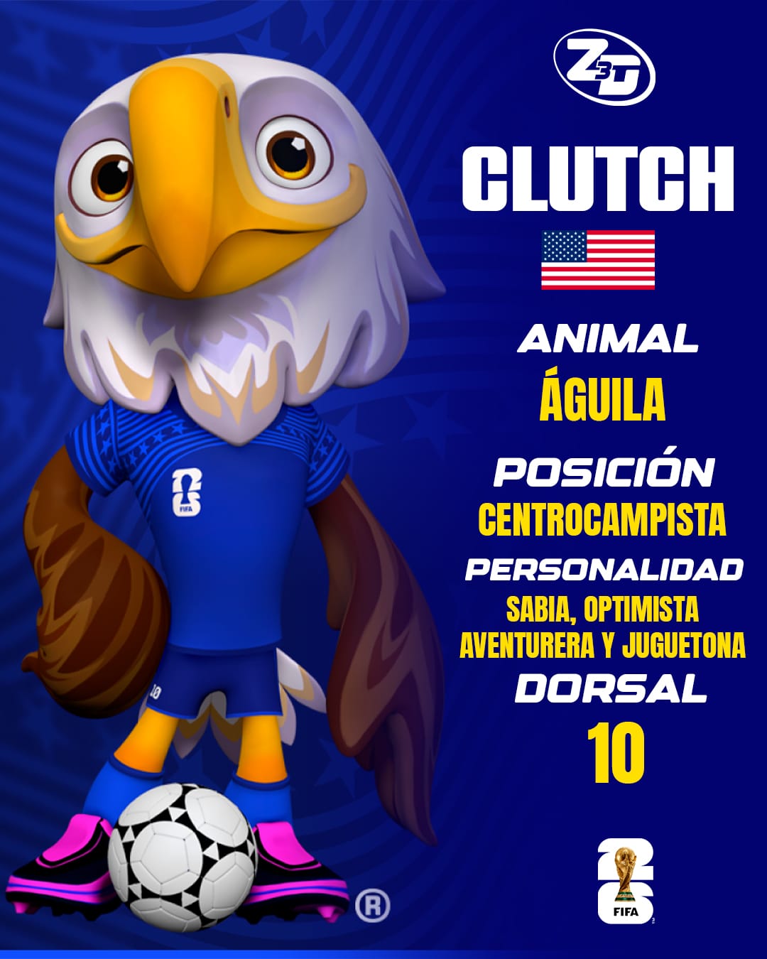 Clutch, un águila real con camiseta azul y el número 10, representa a Estados Unidos. Fue asignada como mediocampista por su visión y capacidad estratégica, cualidades atribuidas a esta ave nacional.