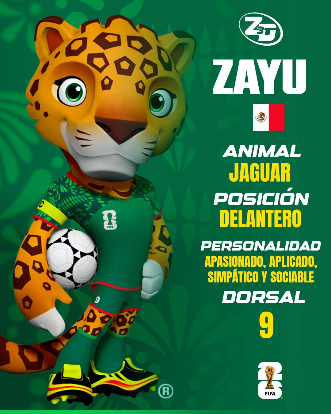 Zayu, un jaguar con la camiseta verde y el número 9, encarna a México. Elegido por ser un animal tradicional del sur del país, se le asignó la posición de delantero en alusión a su fuerza y carácter letal.