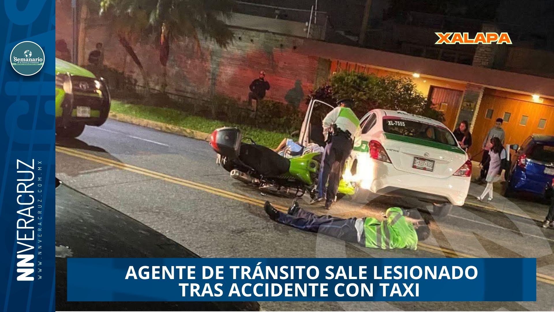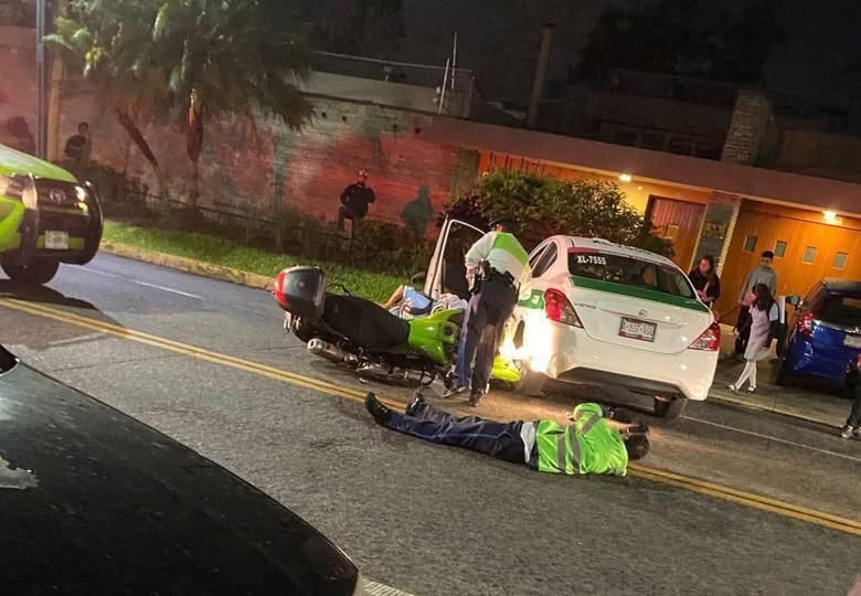 Xalapa, Ver. – La noche de ayer martes, la avenida Ávila Camacho fue escenario de un fuerte accidente que dejó a un agente de Tránsito estatal lesionado, luego de impactar su motocicleta contra un taxi a la altura del parque Bicentenario.