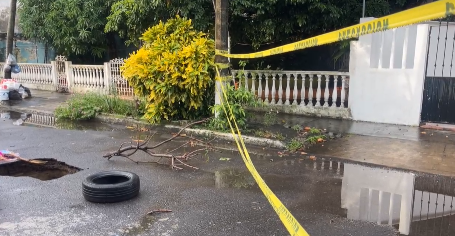 El socavón se encuentra justo en el centro de la calle y debido a su profundidad la vialidad en esta ha sido cerrada a los vehículos para evitar algún accidente.