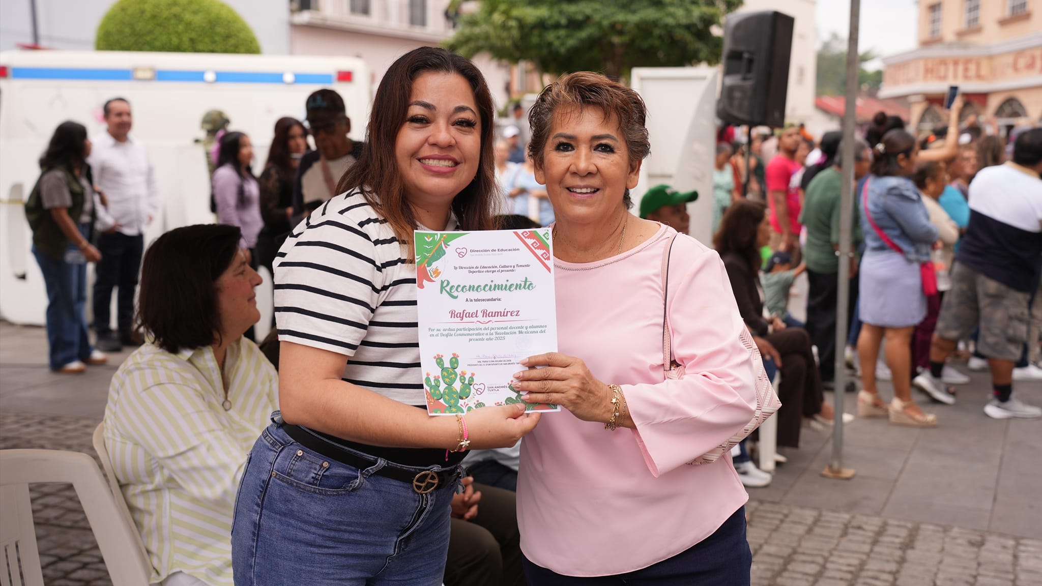 El presidium de autoridades municipales encabezado por la Presidenta Municipal, la doctora María Elena Solana Calzada y acompañada por el Capitán 1° de Infantería, Aldo Joshua Carranza Rescalvo y los regidores María Elida Pino Villaseca, Iván de Jesús Bautista Tom, Mayra Patricia Xolo Hernández, Edgar Leoncio Antemate Caixba, Abelardo Javier Ortiz Navarrete, Ximena Tress Fadanelli, Edgardo Cecilio Ramírez Sosa, Omar Martínez Aranda, Concepción Carmona Caldela, Eleazar Domínguez Maldonado y Concepción Danaé Vázquez Molina, quienes fueron entregando uno a uno, el reconocimiento a los directivos de las escuelas y representantes de los contingentes participantes.