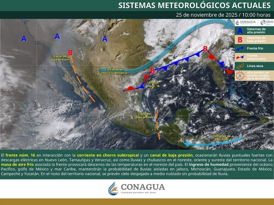 El Frente Frío No. 16, reforzado por una masa de aire polar canadiense, provocará lluvias intensas (75 a 150 mm) en zonas de Puebla, Veracruz y Oaxaca, en interacción con un canal de baja presión en el Golfo de México. 🌧️☔️🌬️💨